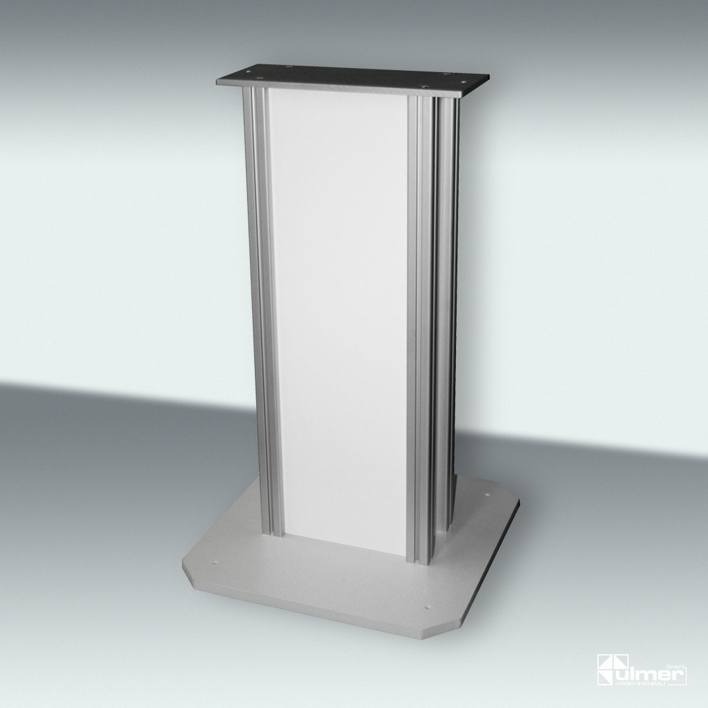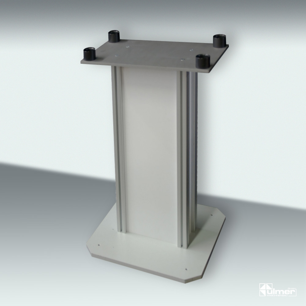 Die Grundständer für Zuführgeräte ZG15 S und ZG200 B2, ZG400 B2 oder für die Schneidemaschinen aus der SM15 und SM30 Serie bestehen aus einer massiven Stahlplatte mit senkrecht montierten Aluminiumprofilen und einer Abschlussplatte mit passendem Lochbild für die Zuführgeräte oder einer Aufnahme für die Maschinenfüße der Schneidemaschine.